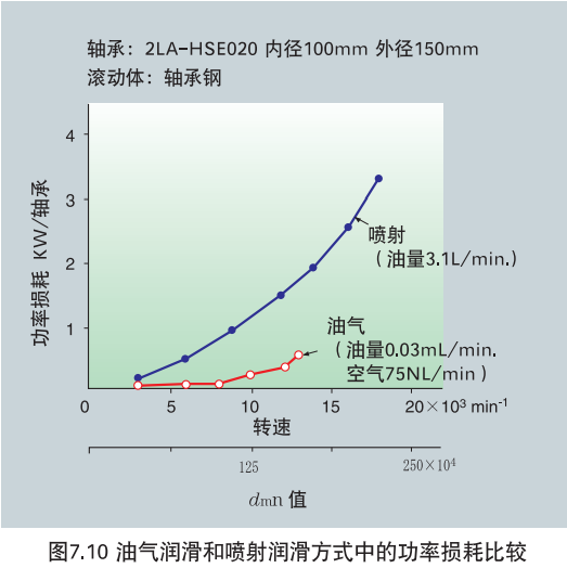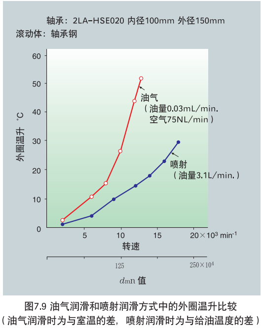 下圖所示為使用相同的軸承時(shí)的油氣潤(rùn)滑和噴射潤(rùn)滑中的溫升例: