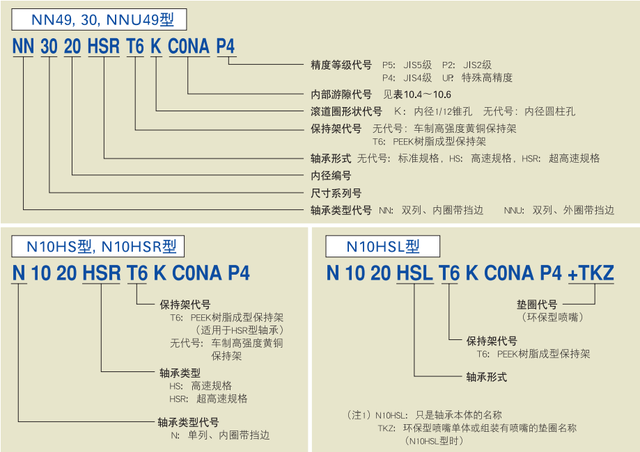 單列圓柱滾子軸承有高速N10HS型和超高速N10HSR型兩種。N10HS型采用車制高強度黃銅保持架。N10HSR型采用特殊樹脂注塑成型保持架,任何一種均可采用脂潤滑或油氣潤滑。