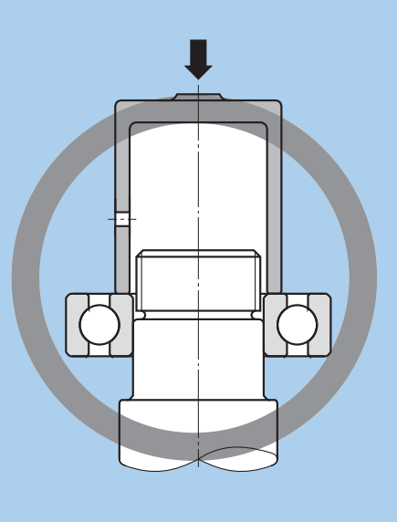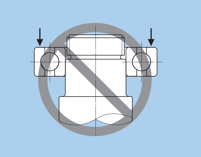 如上圖所示,簡單的對兩邊施加壓力,將軸承壓入,也是不行的,一是壓力要施加在內圈,二是受力容易不均勻,將造成軸承滾道面出現壓痕或傷痕。