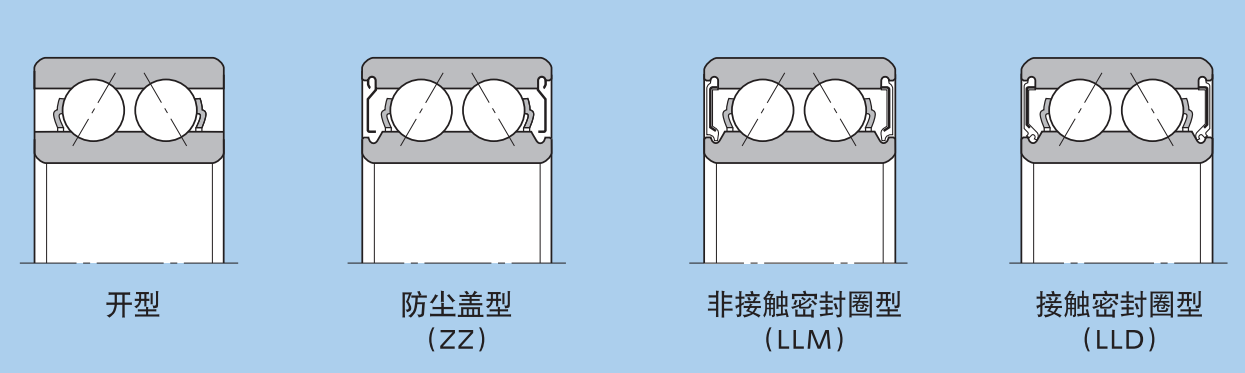 雙列角接觸球軸承一般都是背對背組配的,如上圖所示,接觸角25度,可分為開式、防塵蓋型(代號ZZ)、非接觸密封型(代號LLM)、接觸密封型(代號LLD)。