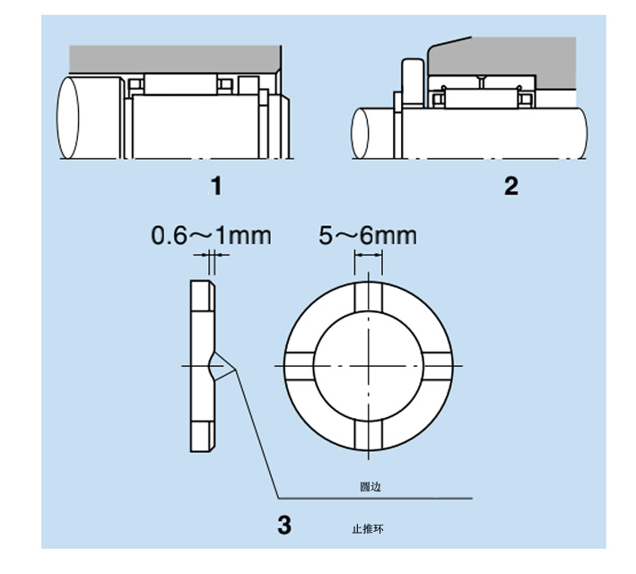當滾針和保持架組件單獨使用,并在軸肩處沿軸向引導時(如下圖1),軸肩表面應在接觸保持架組件側面的位置具有無毛刺、改進的光潔度。在高速應用中,接觸面應硬化并精磨。用壓力機從彈簧板沖壓而成的止推環也適用于作為保持架組件的軸向導軌。當通過使用定位卡環(如下圖1)沿軸向引導保持架組件時,建議在保持架組件和定位卡環之間使用止推環,以便定位卡環的切割端不會直接接觸保持架組件。