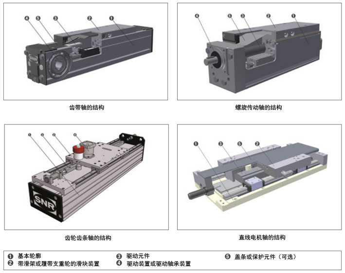 NTN-SNR–線性軸是緊湊型組件,包含導向和驅動元件的組合。模塊化設計以及在產品線和各種產品線中結合線性軸的能力,使用戶能夠為線性運動設計簡單、省時且經濟的解決方案。高質量組件的使用保證了線性軸的高質量和可靠性。下圖顯示了所有NTN-SNR線性軸及其主要組件的基本結構: