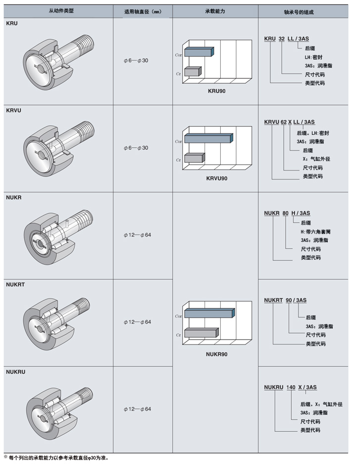 標有后綴(包括“F”)的凸輪從動件類型是符合新標準規范的產品。在裝配方法和潤滑方法方面,它們與傳統產品相同,但通過凸形滾柱和特殊熱處理改善了功能。請注意,后綴包括“F”但沒有油孔的凸輪從動件類型預先填充了尿素基高功能性潤滑脂,并用后綴包括“DO”標識。