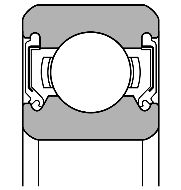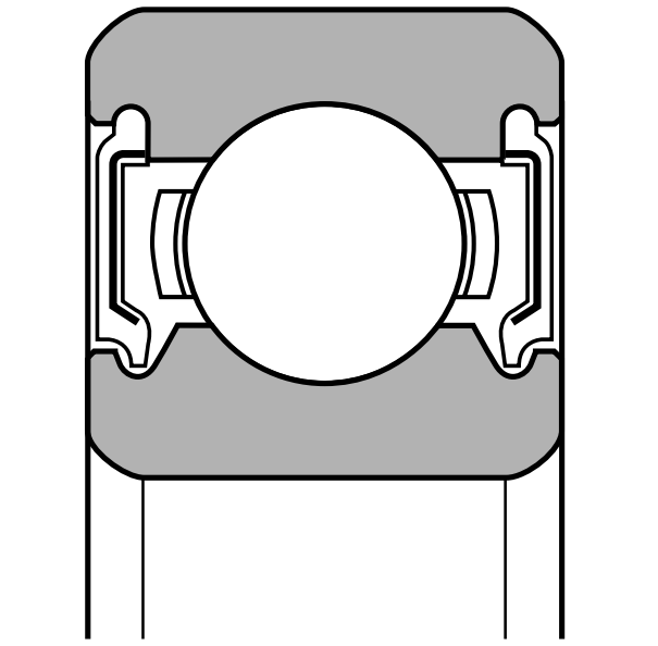 二是LLB型(非接觸密封型),如上圖所示,如上圖所示,密封圈由合成橡膠制成,模制在外圈上,密封圈邊緣沿內圈表面與V型槽對齊,并留有迷宮間隙,密封圈與內圈無接觸,相較ZZ型,LLB型的防塵效果更佳,其他特性與ZZ型基本相同。