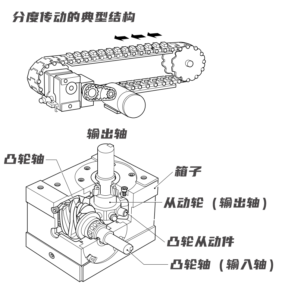 當(dāng)自動(dòng)機(jī)械需要以高速和高精度執(zhí)行如間歇運(yùn)動(dòng)、振蕩和連續(xù)旋轉(zhuǎn)時(shí),需要一些特殊的設(shè)計(jì)來執(zhí)行這些操作,分度凸輪從動(dòng)件由此而生,通過螺栓的凹槽,創(chuàng)造性地完成了這些需求。