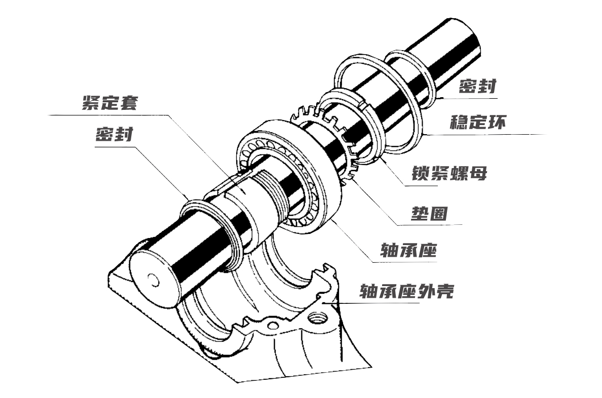 在完成上一遍文章《軸承座如何安裝?軸承座安裝前檢查及準(zhǔn)備工作介紹》撰述的檢查工作后,即可進(jìn)行軸承和相關(guān)部件的安裝工作,軸承和相關(guān)部件的安裝位置關(guān)系如上圖所示。