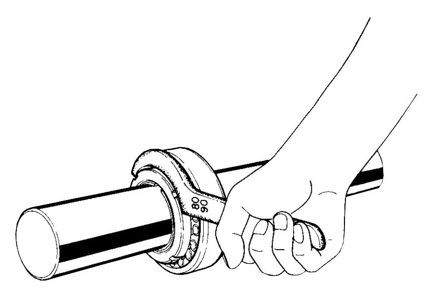 (5) 完全擰緊調(diào)心球軸承時(shí),確保其徑向間隙約為安裝前的一半,對(duì)于調(diào)心滾子軸承,在用測(cè)厚儀測(cè)量其徑向間隙的同時(shí)擰緊螺母,以達(dá)到上表中提供的徑向內(nèi)部間隙值的減少值,確保已安裝的調(diào)心球軸承可以用手平穩(wěn)轉(zhuǎn)動(dòng)(如上圖、下圖所示)。