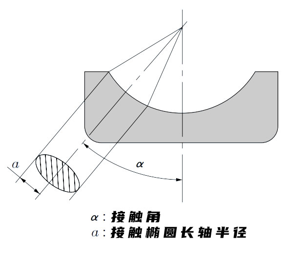 一、滾珠軸承。當(dāng)滾珠軸承(如深溝球軸承和角接觸球軸承)施加軸向載荷時,接觸角隨載荷而變化,當(dāng)超過允許范圍時,滾珠和滾道表面的接觸橢圓從槽中伸出,如上圖所示,接觸面為橢圓,長軸半徑為a,接觸橢圓未超過槽邊緣的臨界載荷為最大允許軸向載荷(即使接觸橢圓未超過槽邊緣,允許軸向載荷必須為Pmax<4200 MPa)。該載荷因軸承內(nèi)部間隙、槽曲率、槽邊緣等而異。