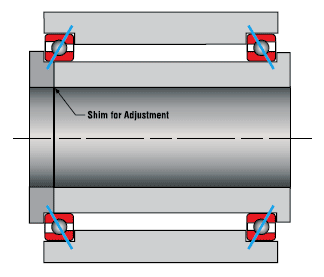 一對角接觸軸承在施加力矩載荷下的壽命和承載能力可以通過使軸承進一步間隔來增加,軸在施加力矩下的角偏轉(zhuǎn)(傾斜)也隨著間距的增加而減小,然而,如果軸和殼體采用不同的材料或在不同的溫度下工作,軸承可能會對熱膨脹差更敏感。