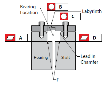 軸和殼體都應有一個淺的導入倒角,如上圖所示,以便于裝配,軸承座拐角處的圓角半徑應小于軸承上的倒角(軸承表中的尺寸“F”),在使用過盈配合的地方,應使用熱或冷來增加間隙并簡化裝配。
