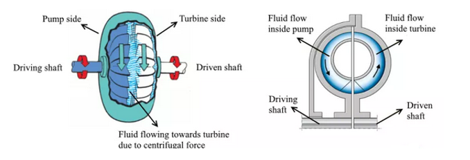 液力聯(lián)軸器由渦輪和泵兩部分組成,如上圖所示,這兩個部分具有以一定角度安裝的葉片,泵位于驅(qū)動軸的端部,渦輪位于被驅(qū)動的軸上。當(dāng)驅(qū)動軸由于離心力而旋轉(zhuǎn)時,流體通過中心進(jìn)入泵,可以在渦輪機(jī)和泵之間引入一個稱為反應(yīng)器的額外部件,該反應(yīng)器用作變矩器,并作為自動變速器系統(tǒng)中手動離合器的替代品。液力聯(lián)軸器主要應(yīng)用于工業(yè)和船舶應(yīng)用,在這些應(yīng)用中,變速器的受控啟動至關(guān)重要。