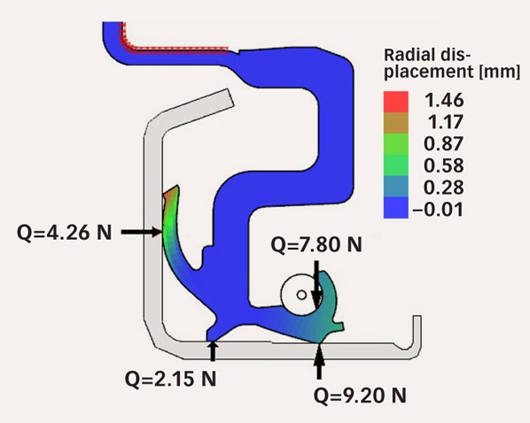 計算安裝在軸上的密封件的能力是一個附加功能,當(dāng)安裝密封件時,它會在反表面上施加一個力,稱為唇緣力,唇緣力是密封件在靜態(tài)和動態(tài)操作條件下最重要的參數(shù)之一,唇緣力可確保所需的密封性,但也會導(dǎo)致唇緣下的密封摩擦,此外,當(dāng)密封材料老化時,可以使用彈簧來保持足夠的密封唇力。因此,準確預(yù)測不同操作條件下的唇緣力是模擬工具的關(guān)鍵要求,這將有助于減少設(shè)計迭代次數(shù),從而縮短新產(chǎn)品的上市時間。