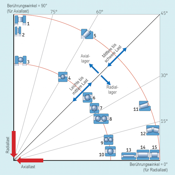 每個滾動軸承都有一個接觸角,力通過該接觸角在軸承內傳遞,最簡單的情況是深溝球軸承,在純徑向載荷下,其接觸角為0°,相比之下,角接觸球軸承的接觸角總是大于0°,如上圖所示。