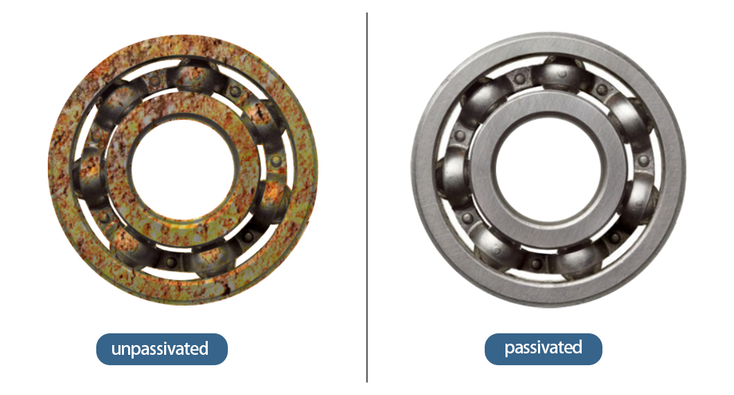 鈍化是一種非電解精加工工藝,可以用來提高不銹鋼軸承的抗腐蝕性和防銹性,生銹需要鐵,因此,如果能從金屬表面去除鐵離子,那么大部分鉻離子就會出現在金屬表面,具體而言,在鈍化過程中,鈍化溶液中的氧化物與不銹鋼發生反應,在不銹鋼軸承的表面上可以出現厚度約為1-10納米的鈍化膜,薄膜致密、完整,不易損壞,可以進一步提高不銹鋼軸承的耐腐蝕性,并可以更有效地保護不銹鋼軸承的表面。