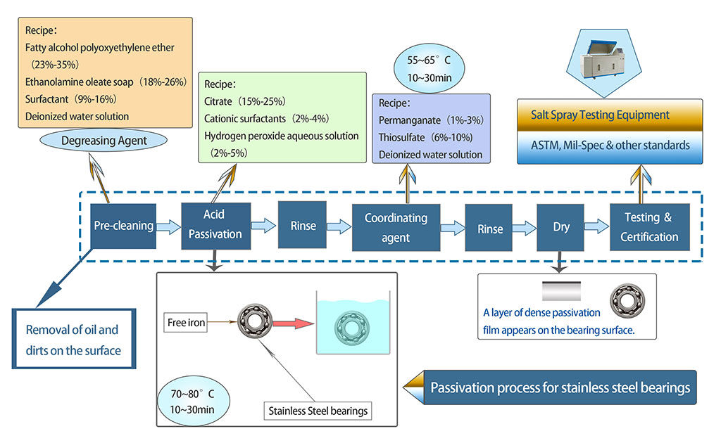 通過檸檬酸浴,可以去除不銹鋼軸承表面的任何游離鐵顆粒,檸檬酸浴不需要特殊處理,也不會排放任何有毒氣體,已成為一種被高度接受的方法,鈍化工藝后的測試可以驗證鈍化的有效性,使軸承符合 ASTM、Mil Spec 以及其他各種行業標準,具體鈍化工藝請參見上面的流程圖。