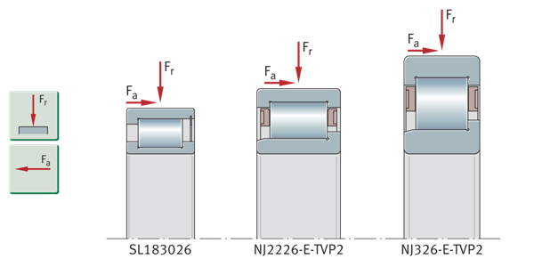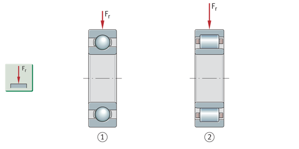 徑向承載能力——深溝球軸承/圓柱滾子軸承的比較 ①深溝球軸承–徑向承載能力較低 ②圓柱滾子軸承NU系列–徑向承載能力更高 | ![]() |