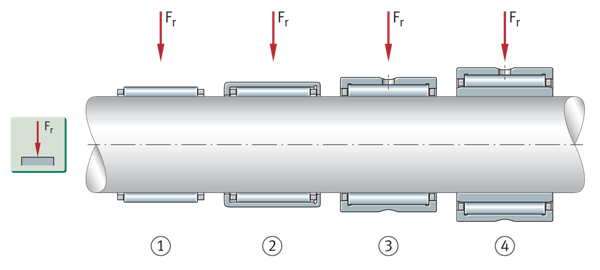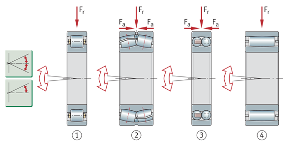 用于靜態(tài)和動(dòng)態(tài)錯(cuò)位補(bǔ)償?shù)妮S承 ①滾子軸承(非定位軸承) ②調(diào)心滾子軸承(定位軸承) ③調(diào)心球軸承(定位軸承) ④環(huán)形滾子軸承(非定位軸承) | ![]() |