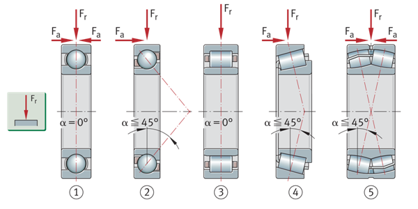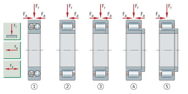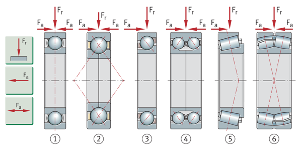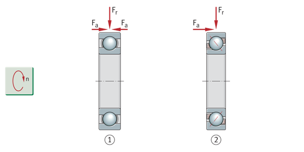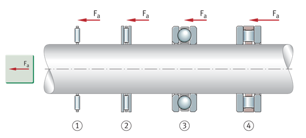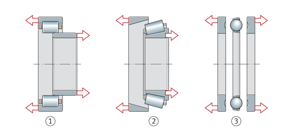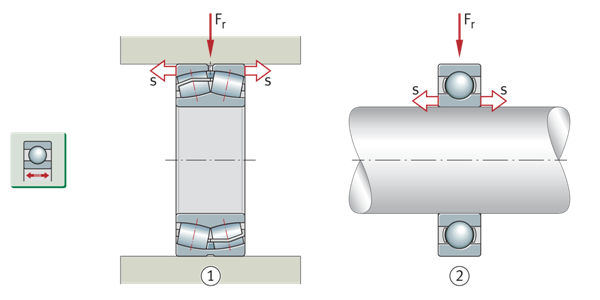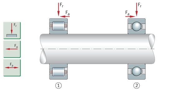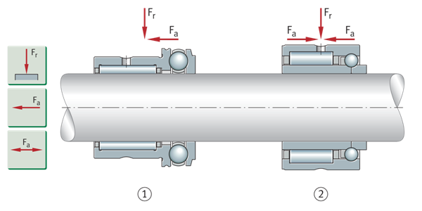 一個(gè)方向上存在的軸向載荷只能由單列角接觸球軸承和圓錐滾子軸承、圓柱滾子軸承NJ以及NU+HJ和軸向調(diào)心滾子軸承支撐。對(duì)于交替的負(fù)載方向,這些軸承必須始終與第二個(gè)軸承一起安裝(第二個(gè)軸承必須在相反的方向上提供支撐)。對(duì)于成組安裝,可使用配對(duì)的單列角接觸球軸承或由兩個(gè)單個(gè)軸承組成的匹配圓錐滾子軸承組。