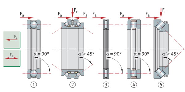 如果存在低到中等的純軸向載荷,合適的軸承是軸向深溝球軸承和四點(diǎn)接觸軸承,如果存在一個(gè)方向的軸向載荷,則可以使用單向軸向深溝球軸承。