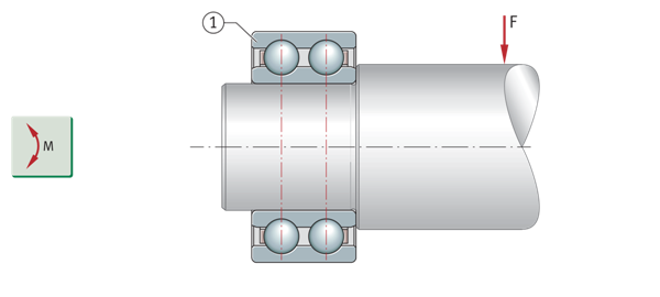 如果負(fù)載偏心,軸承會(huì)受到傾斜力矩的作用。除了雙列深溝球軸承和角接觸球軸承外,在這種情況下,適合使用面對(duì)面或背對(duì)背配對(duì)的單列角接觸球或圓錐滾子軸承