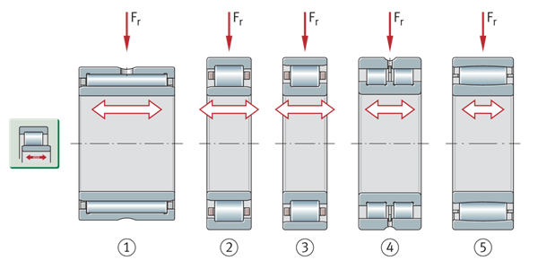 適合作為與軸承補(bǔ)償?shù)姆嵌ㄎ惠S承配對(duì)的軸承有很多,包括具有一個(gè)無(wú)肋環(huán)(內(nèi)圈或外圈)的圓柱滾子軸承NU和N、圓柱滾子軸承NJ、一些設(shè)計(jì)的滿裝圓柱滾子軸承(SI軸承)、滾針軸承和環(huán)形滾子軸承等。