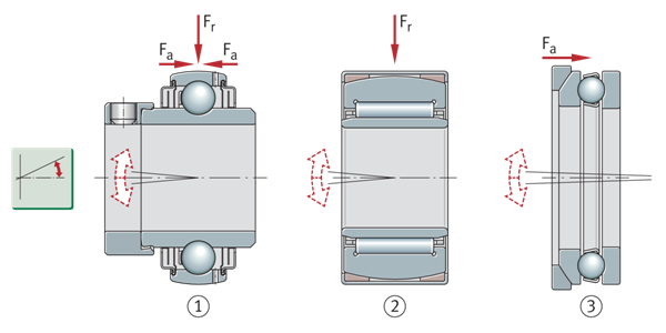 如果軸和殼體之間發(fā)生偏斜,例如,如果軸承座未對(duì)齊,軸在負(fù)載下變形,或者軸承位置相距相當(dāng)大的距離,則必須通過(guò)適當(dāng)?shù)妮S承(自對(duì)準(zhǔn)軸承)進(jìn)行補(bǔ)償。如果使用了單獨(dú)的外殼,如軸承座或法蘭外殼,也應(yīng)預(yù)計(jì)會(huì)出現(xiàn)錯(cuò)位。類似的影響(軸承位置的對(duì)準(zhǔn)不準(zhǔn)確性)是由滾動(dòng)軸承環(huán)的徑向座表面和橫向接觸表面之間的角度缺陷引起的。