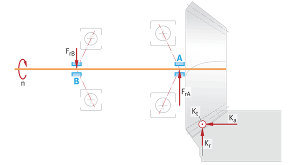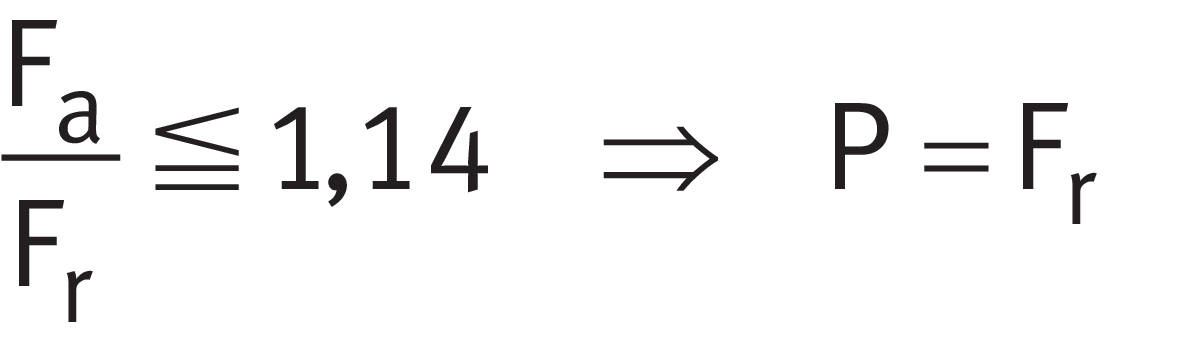 為了計算等效動態軸承載荷P,然后將Fa的計算值用于軸承A,因為Fa/FrA>1,14(8,45 kN/7,30 kN>1,14)。