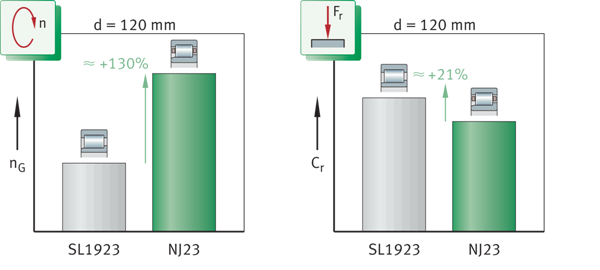 帶保持架/滿裝圓柱滾子軸承,速度和承載能力的比較: