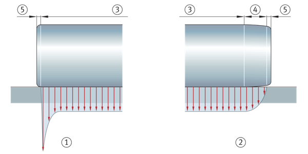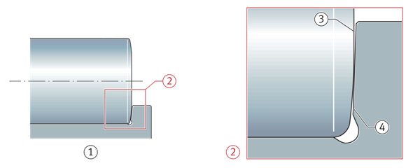 軸和殼體肩部以及隔圈等的安裝尺寸必須確保軸承套圈的接觸面具有足夠的高度。從軸承座到橋臺肩的過渡必須設計為符合DIN 5418:1993的圓角或符合DIN 509:2006的咬邊。產品表中給出了橋臺肩半徑和直徑的經驗證的安裝尺寸。這些尺寸是限制尺寸(最大或最小尺寸),實際值不應高于或低于指定值。