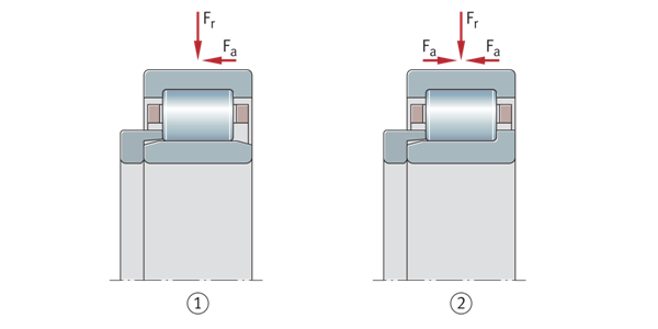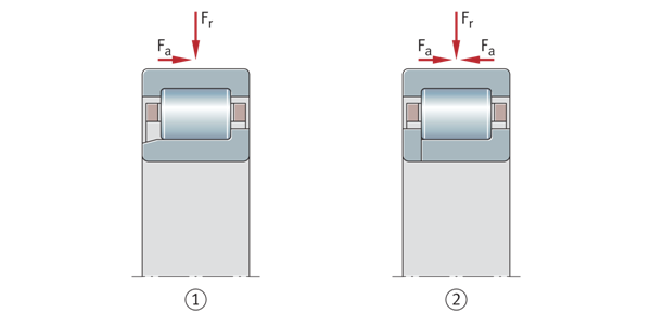 軸承可以通過內圈及外圈上的肋支撐一側的軸向載荷,為了確保無故障運行(防止滾輪傾斜),必須始終在承受軸向載荷的同時承受徑向載荷。比率Fa/Fr不得超過0,4。對于具有環形滾子端部(TB設計)的軸承,允許值高達0.6。