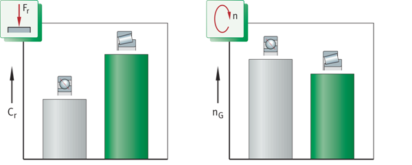 承載能力和速度比較——單列圓錐滾子軸承/單列角接觸球軸承