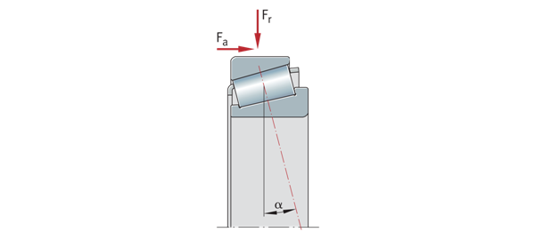 軸承的軸向承載能力取決于標稱接觸角α,此角度越大,軸承承受的軸向載荷就越高。接觸角的大小,以及軸承的承載能力,由產(chǎn)品表中的值e表示。大多數(shù)軸承系列的標稱接觸角α在10°到20°之間。在特殊系列中,α約為28°至30°。313、323、T5ED和T7FC系列軸承由于其特別大的接觸角而具有非常高的軸向承載能力。