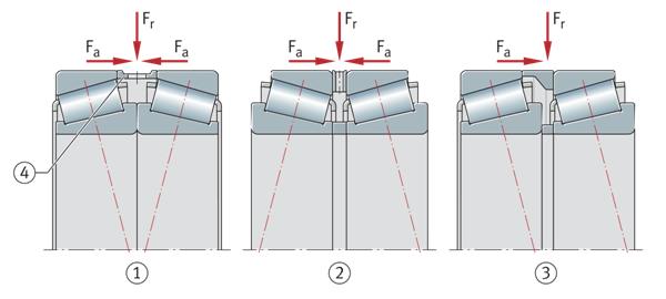 如果軸承的承載能力不足,或者軸需要在兩個方向上以特定的軸向間隙進行引導,則可使用配對軸承組。配對的圓錐滾子軸承基本上有三種配置,包括X型、O型和串聯(lián)配置。