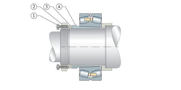帶壓力環(huán)的螺母,用于壓入帶錐形孔帶退卸套的軸承 ①壓力螺釘 ②軸螺母 ③壓力環(huán) ④退卸套 | ![]() |