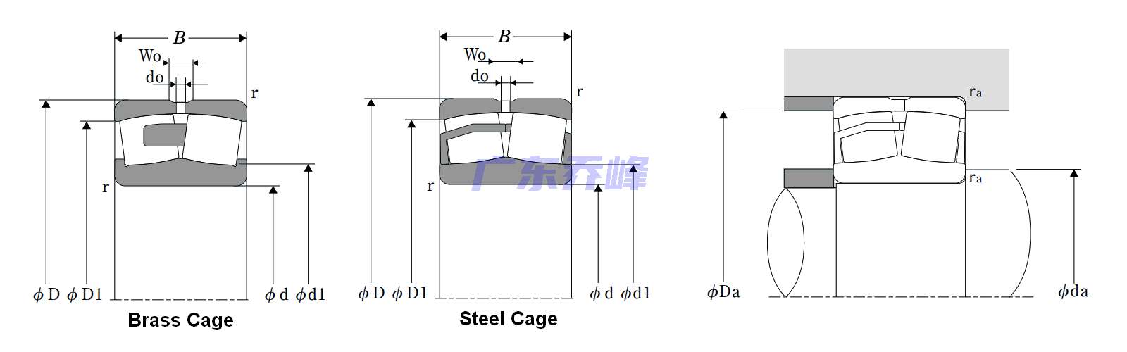 軸承型號:23036EAW33C3,調心滾子軸承 - 圓柱孔&注油槽,230系列,其基礎型號為23036,后綴列表:【EA:EA型,帶壓制鋼保持架,高載荷】【D1:外圈潤滑油槽油孔】【C3:C3游隙】