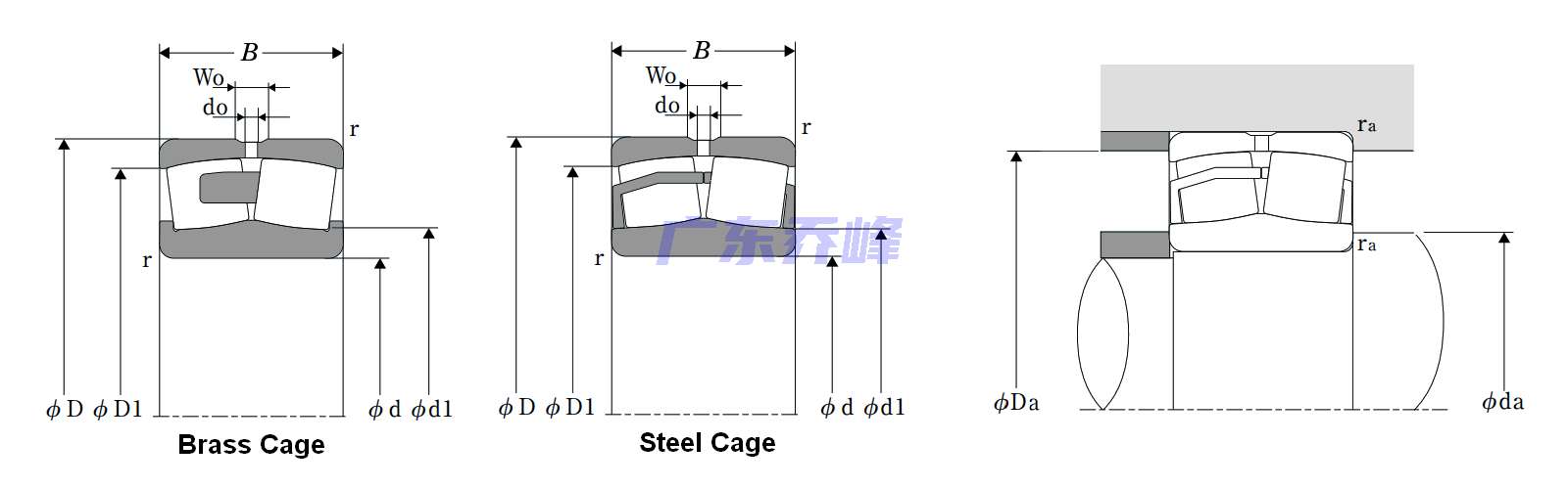 一體式機加工黃銅保持架,抗沖擊性好,剛度大(B型:每排一個機加工黃銅保持架)