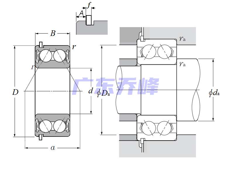 | 雙列角接觸球軸承 - 雙面密封帶止動(dòng)環(huán) - 尺寸 | |