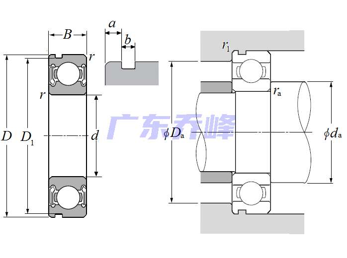 | 單列深溝球軸承 - 雙面密封(非接觸式橡膠密封),帶止動環槽 - 尺寸 | |
