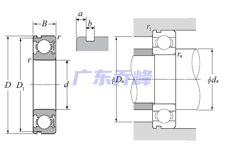 | 單列深溝球軸承 - 單面密封(非接觸式橡膠密封)帶止動環槽 - 尺寸 | |
