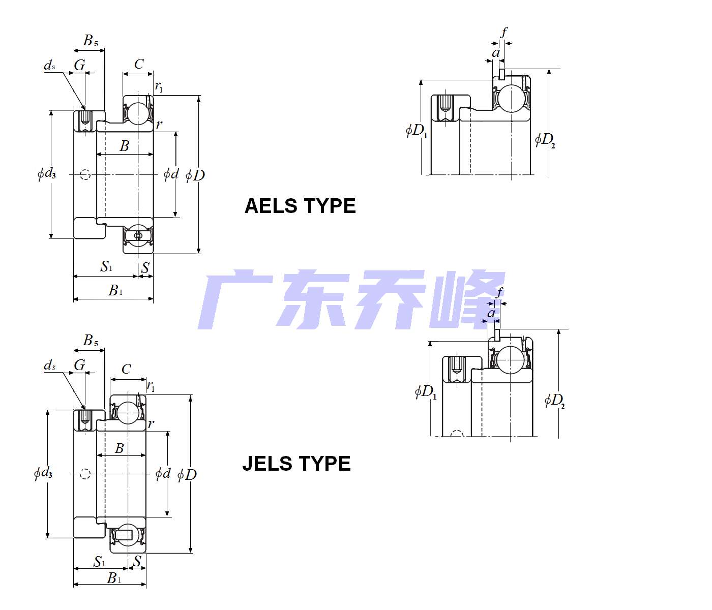 軸承型號:AELS205-015D1NR,帶偏心鎖緊套的外球面軸承,狹窄內圈 - 圓柱內徑,帶止動環,其基礎型號為205-015,前綴列表:【AEL:窄內圈,帶止動環槽】【S:圓柱外圈】,后綴列表:【D1:帶油槽油孔,可再潤滑】【NR:帶止動環和止動槽】