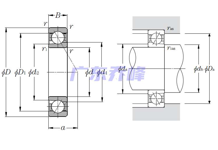 | 電機和車床用單列角接觸球軸承 - 尺寸 | |