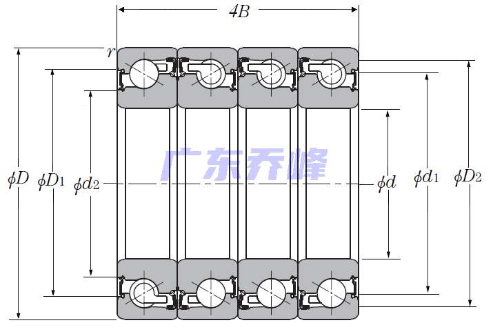 | 滾珠絲杠用四列角接觸推力球軸承 - DFTT配對,雙面密封,三排承受軸向載荷 - 尺寸 | |