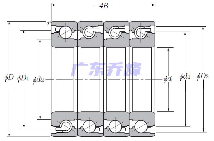 軸承型號:BST40X72-1BDBTT,滾珠絲杠用四列角接觸推力球軸承 - DBTT配對,開式,三排承受軸向載荷,其基礎型號為40X72,前綴列表:【BST:Ball Screw Support,即滾珠絲杠支撐】,后綴列表:【-1B:標準預緊】【DBTT:四列配對 / \ \ \】