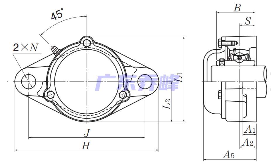 軸承型號:CM-UCFL208D1,雙螺栓菱形法蘭式軸承座單元,鑄造外殼,帶緊定螺釘,鑄造防塵蓋,封閉端蓋,UCFL型