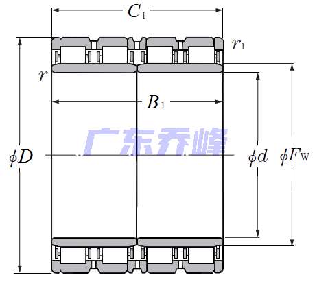 | 四列圓柱滾子軸承帶空心滾柱&銷式保持架 - 尺寸 | |