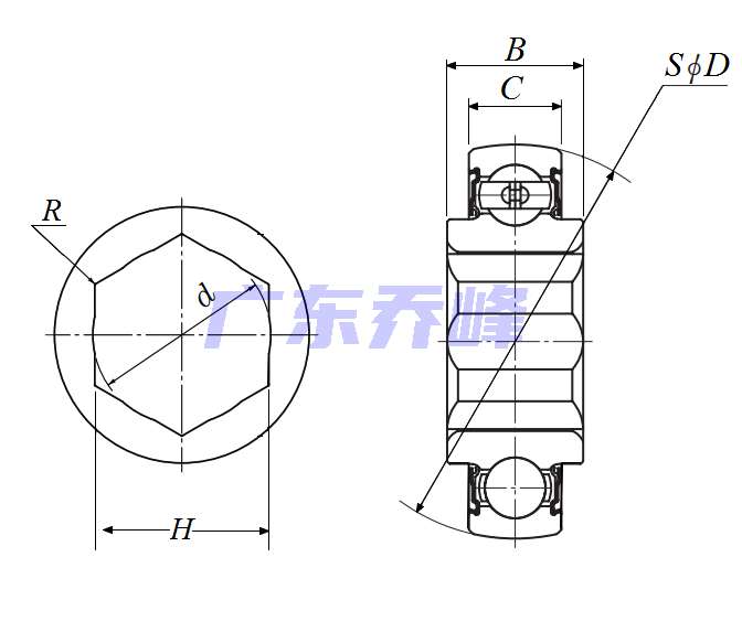 軸承型號:HPS100GP,帶緊定襯套的軸承 - HP型,六角孔,球面外圈,其基礎型號為100,前綴列表:【HP:盤式軸承】【S:球面外圈】,后綴列表:【G:單層唇封】【P:不可再潤滑】