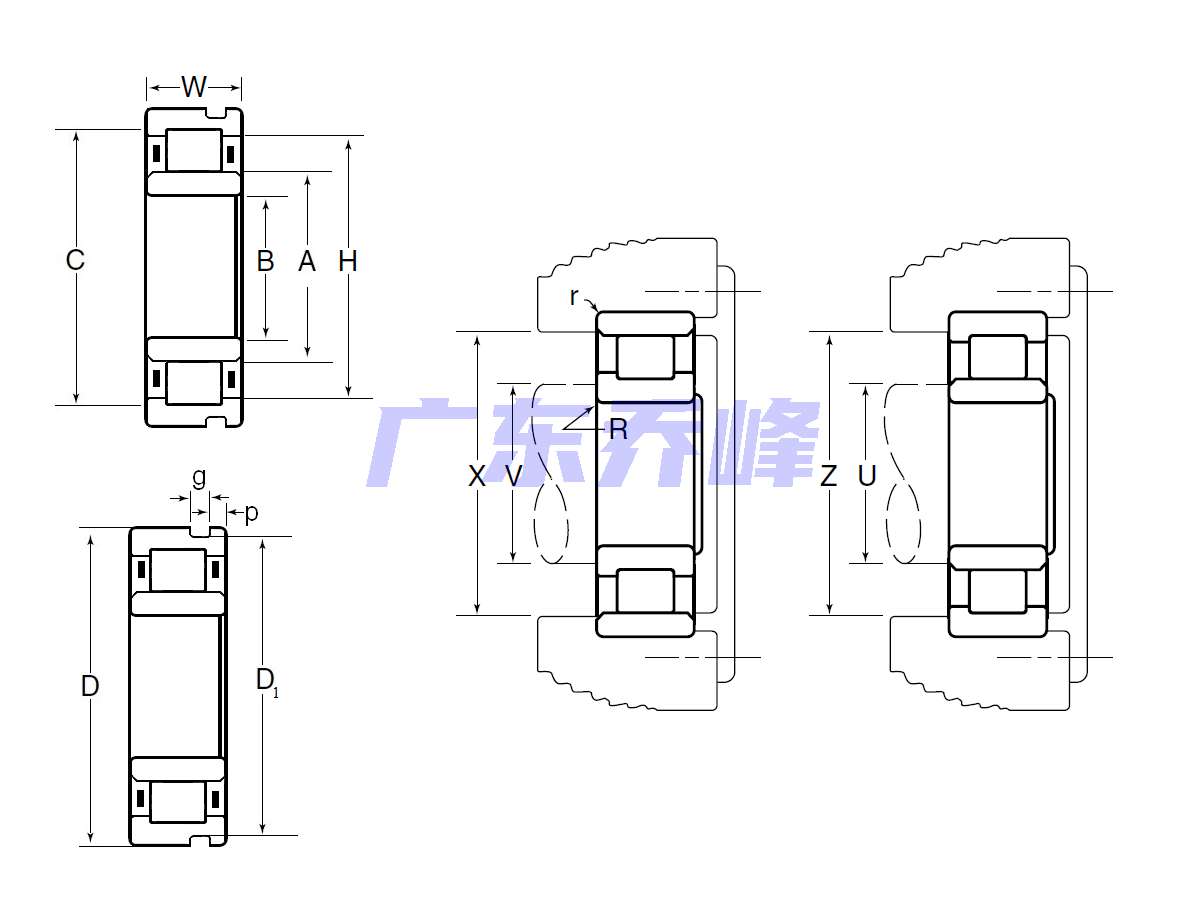 | 圓柱滾子軸承 -可分離型,普通內圈,外圈帶兩個加強筋,帶止動環槽 - 尺寸 | |