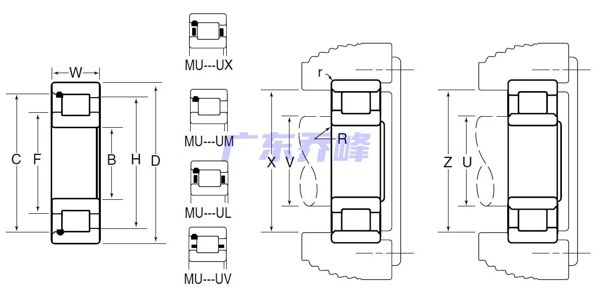 軸承型號:MU1211UL,圓柱滾子軸承 - 不可分離型,內圈帶兩個加強筋,外圈帶一個加強筋,帶擋圈,其基礎型號為1211,前綴列表:【MU:M:NTN BOWER產品,標準公制尺寸系列,U:內圈雙擋邊】,后綴列表:【U:外環內徑上帶一個擋邊和一個擋圈】【L:復合鋼保持架】