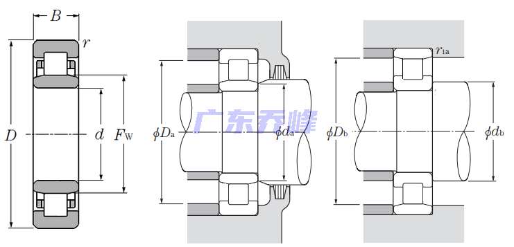 圓柱滾子軸承 -可分離型,普通內圈,外圈帶兩個加強筋 - NU型 - 尺寸