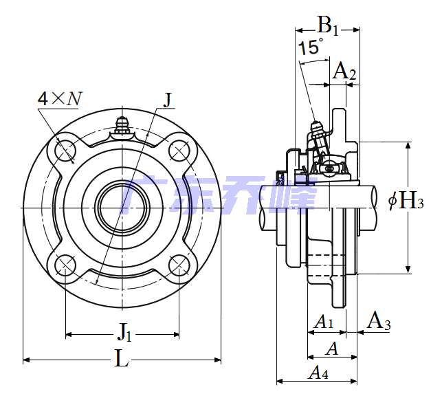 軸承型號:S-UKFC212D1(配合軸承:HS2312),四螺栓圓形法蘭式軸承座,鑄造外殼,帶緊定襯套,壓制鋼防塵蓋,開式端蓋,UKFC型